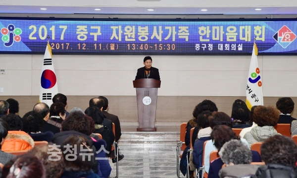 대전 중구(구청장 박용갑)은 지난 11일 청 내 대회의실에서 자원봉사자․봉사단체 관계자 등 200여명이 참석한 가운데 2017 중구 자원봉사가족 한마음대회를 개최했다.