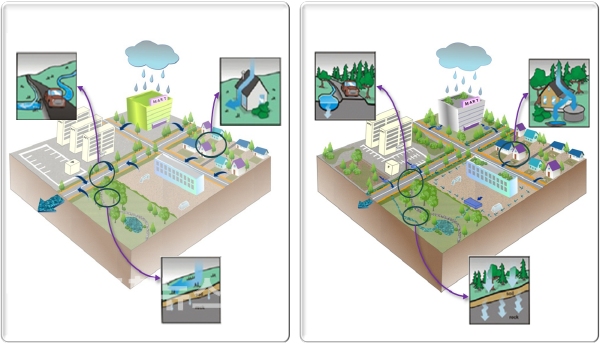 행복청은 도시의 불투수면 증가에 따른 물 순환 왜곡 문제를 해결하기 위해 흙․자갈 식생수로, 빗물정원, 투수블록 등을 조성하는 친환경 분산식 빗물관리 방법인 저영향개발(LID)기법 도입을 추진해 왔다.