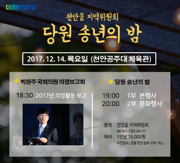 박완주 의원, 14일 '더민주 천안 당원 송년의 밤' 개최