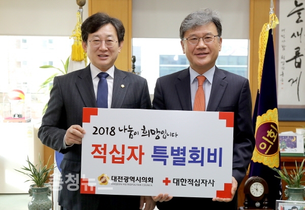 대전시의회(의장 김경훈)는 14일 의장실에서 대한적십자사 대전세종지사(회장 정상철)에 적십자 특별회비를 전달했다.