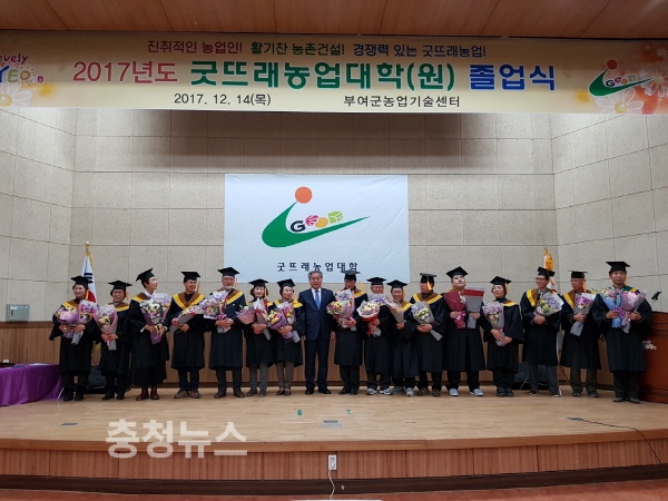 2017학년도 굿뜨래농업대학(원) 졸업식에는 환경농업과 28명, 토마토과 24명, 양봉과 25명, 6차산업과(대학원) 27명 총 104명의 졸업생이 가족 및 내빈들의 축하를 받으며 졸업장을 받았다.