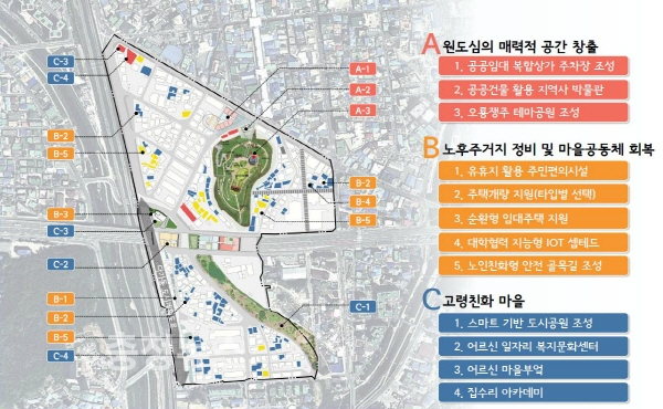 남산지구 도시재생 뉴딜사업은 남산테마공원 조성, 어르신 일자리복지센터와 노후주거지 정비, 마을 공동체 회복을 위한 사업으로, 유휴지를 활용한 주민편익시설, 주택개량지원, 크라우드 펀딩 사회주택 보급사업, 안전한 골목길 조성 등 12개 사업을 추진할 전망이다.