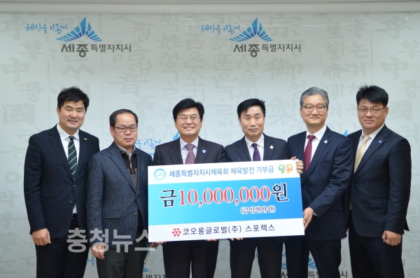 코오롱글로벌(주) 스포렉스(송승회 본부장)는 14일 세종시청에 방문해 세종체육발전에 사용해 달라며 체육발전기부금을 전달했다고 밝혔다.