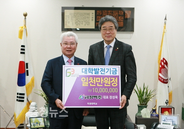 목원대학교(총장 박노권)는 18일 본관 총장실에서 (주)금성백조주택(회장 정성욱)으로부터 대학발전기금 1천만원을 기탁 받았다고 밝혔다.
