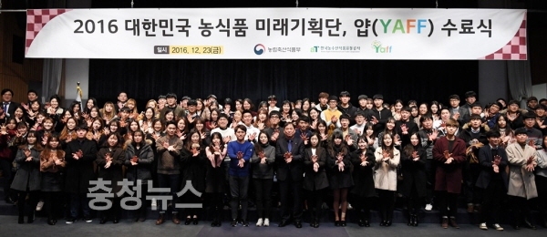 농림축산식품부(장관 김영록)와 한국농수산식품유통공사(aT, 사장 여인홍)는 22일 양재동 aT센터에서 농식품 분야 청년 일자리창출과 미래인재육성을 위해 운영중인 ‘대한민국 농식품미래기획단, 얍(YAFF)’의 2017년 수료식 및 성과보고회를 개최했다.