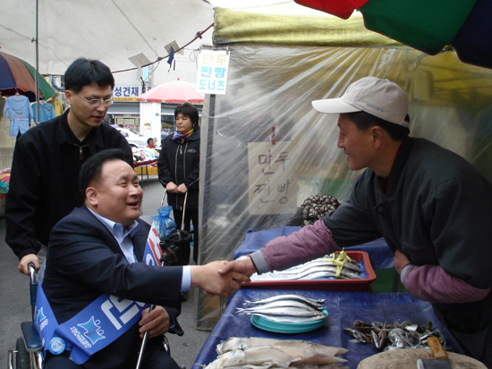 자유선진당 이상민 후보는 휠체어를 타고 현역 구의원들과 함께 장대동 시장에서 바닥 민심잡기 위한 자신의 명암을 대량으로 돌리면서 지지를 호소 하고 있다.