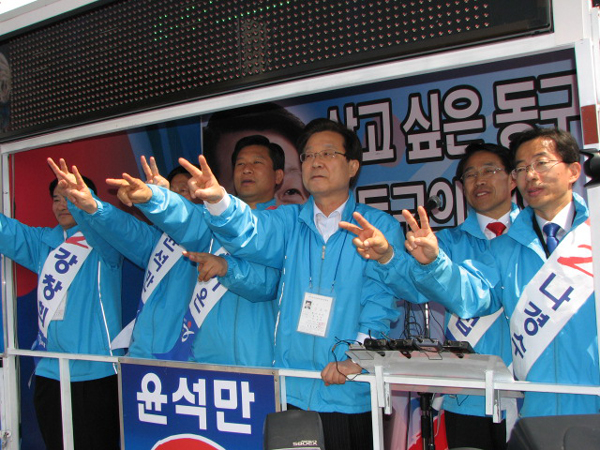 한나라당 동구 윤석만 후보는 " 집권 여당의 참신한 후보, 발로 뛰는 능력있는 후보를 뽑아야 한다"고 말했다.이어 "대전역사를 쇼핑몰이 포합된 명품역사로 만들어 대전의 랜드마크로 만들겠다"면서 지지를 호소했다.