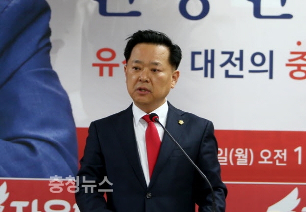 권영진 자유한국당 유성구청장 예비후보가 15일 4대전략과 20개 정책과제를 발표하기에 앞서 ‘유성문화에 스며들다’에 대해 설명했다.