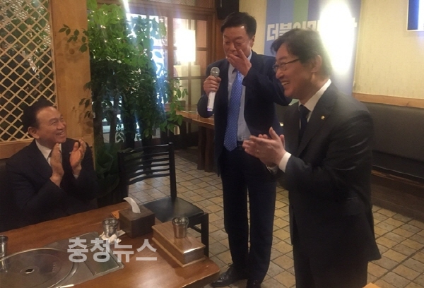 박범계 대전시당위원장이 구본영 천안시장, 이규희 천안갑 국회의원 예비후보 가 환담을 하고 있다