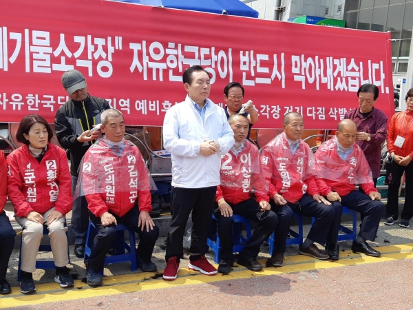 자유한국당 소속 금산지역 후보자들이 의료폐기물소각장시설 반대를 주장하며 삭발식에 나서 눈길을 끌었다.