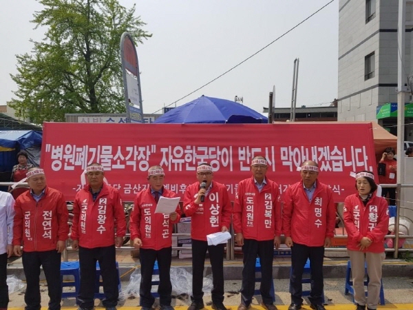 이상헌 금산군수 예비후보를 비롯한 후보자들은 27일 농협 금산군지부 앞에서 열린 결의대회에서 의료폐기물설치를 끝까지 막아내겠다고 밝혔다.
