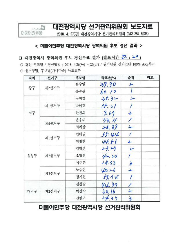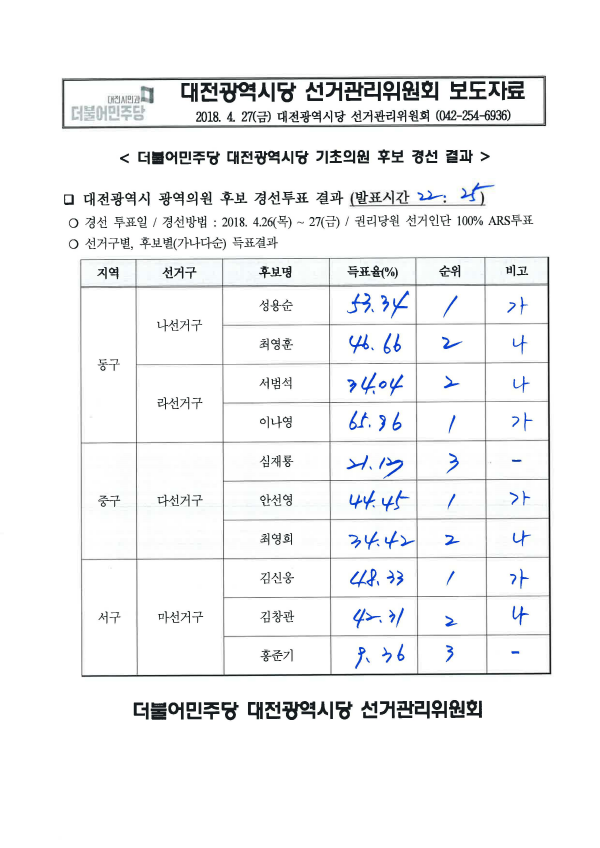 더불어민주당 대전시당 공관위는 27일 시·구의원 공천을 확정했다.