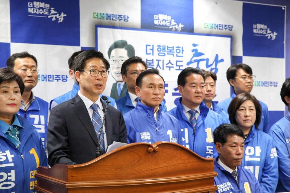 양승조 더불어민주당 충남도지사 후보가 2일 오전 충남도청 프레스센터에서 홍성·예산 더불어민주당 지방선거 출마후보자들과 함께 ‘제14차 충남도지사 공약’을 발표했다.