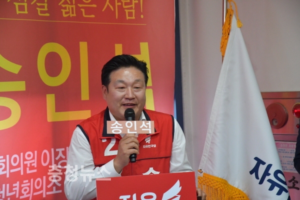 그는 자신의 슬로건인 ‘일로써 평가받고 일로써 검증받는 송인석’을 외치며 “주민을 섬길 사람 저 한 번 믿어 달라”고 지지를 호소했다.