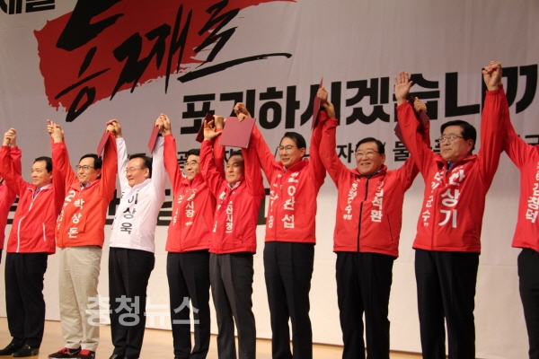 정진석 의원은 행사에 앞서 “문재인 정부는 잔혹한 정부다. 박근혜, 이명박 전대통령과 국정원장 5명도 현재 교도소에 있다. 일자리가 줄었다. 경제실패정책에 대해 심판해야 한다”고 강조했다.
