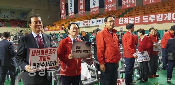 홍문표 사무총장은 “안희정 때리기에 나서며 충절의 고향을 망신시킨 민주당은 출마를 하면 안된다. 염치가 없는 정당”이라고 맹비판했다.