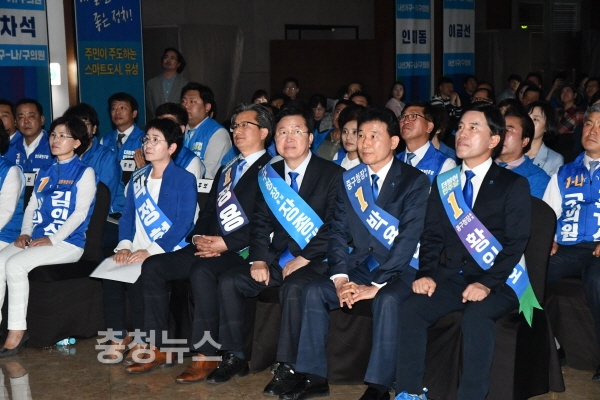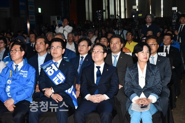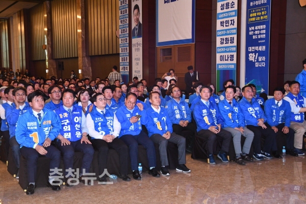 추미애 대표는 개회사를 통해 허태정 대전시장 후보를 치켜세운 뒤 집권여당의 전폭적인 뒷받침을 약속하며 허 후보와 후보자들에게 힘을 실어줬다.