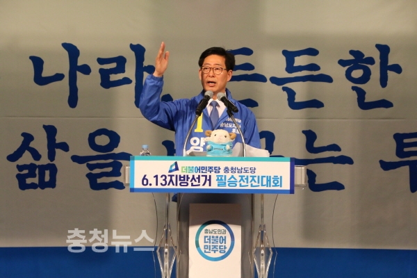 박 위원장은 특히 양승조 충남도지사 후보에 대해 “한결같은 가치관을 지닌 검증되고 준비된 후보”라며 “양승조는 민주당이고, 민주당이 곧 양승조다. 더 행복한 충남을 위해, 양승조가 정답”이라고 강조했다.