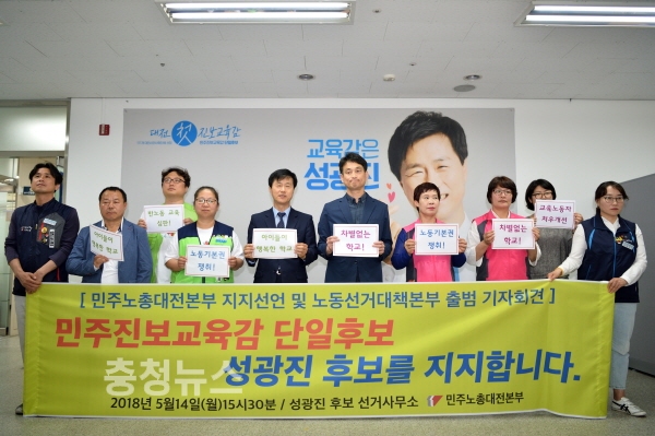민주노총대전본부(본부장 이대식)는 14일 성광진 대전교육감 예비후보 사무실에서 성 후보를 지지한다고 밝혔다.