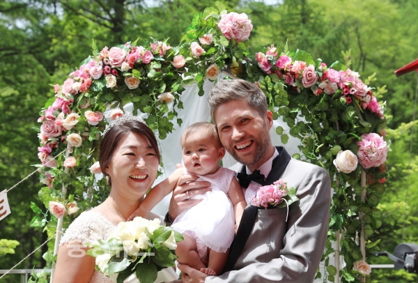 15일 강원도 횡성군 둔내면 국립횡성숲체원(원장 장관웅)에서 하객 30여 명이 참석한 가운데 네덜란드에 입양된 멜라니(34, 좌측)씨가 그의 남편 마틴(39) 씨, 딸 보미(1) 양과 '숲속 아름다운 결혼식'을 치른 뒤 기념촬영