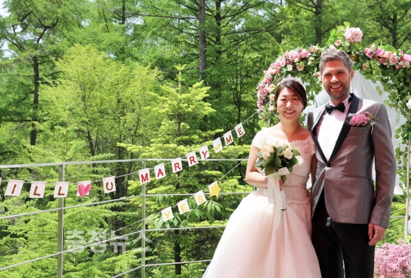 15일 강원도 횡성군 둔내면 국립횡성숲체원(원장 장관웅)에서 하객 30여 명이 참석한 가운데 네덜란드에 입양된 멜라니(34, 좌측)씨가 그의 남편 마틴(39) 씨와 '숲속 아름다운 결혼식'을 치른 뒤 기념촬영