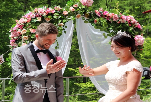 15일 강원도 횡성군 둔내면 국립횡성숲체원(원장 장관웅)에서 하객 30여 명이 참석한 가운데 네덜란드에 입양된 멜라니(34, 우측)씨가 그의 남편 마틴(39) 씨와 '숲속 아름다운 결혼식'에서 결혼반지를 교환하며 즐거워하고 있다