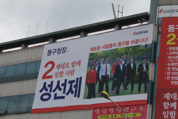 이와 함께 보조 현수막에는 자유한국당 동구 후보자 전원이 함께 나와 눈길을 끌었다.