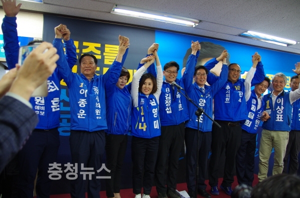 더불어민주당 김정섭 공주시장 후보가 19일 선거사무소 개소식을 열고 세과시에 나서며 필승을 다짐했다.