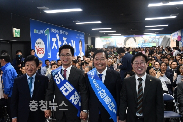 (왼쪽부터)박병석 의원, 허태정 대전시장 후보, 장종태 서구청장 후보, 박범계 의원