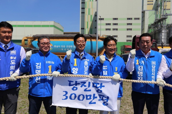 양승조 더불어민주당 충남도지사 후보가 21일 김홍장 당진시장 후보, 김명선, 홍기후 도의원 후보 및 시의원 후보와 함께 당진·평택항 서부두매립지 현장을 찾아 ‘잃어버린 당진 땅 되찾아오기’ 행사를 진행했다.