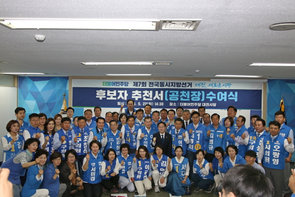 더불어민주당 대전시당(위원장 박범계)은 22일 소속 시구의원 후보자 70여명에게 후보자 추천서(공천장)를 수여하고 6.13지방선거 승리를 다짐했다.