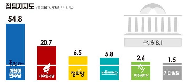 정당 지지도조사에서 더불어민주당이 압도적인 1위로 나타났다. 더불어민주당이 54.8%로 자유한국당(20.7%), 정의당(6.5%), 바른미래당(5.8%), 민주평화당(2.6%)을 제쳤다. 기타 정당은 1.5%로 조사됐고, 무당층은 8.1%이다.