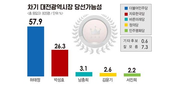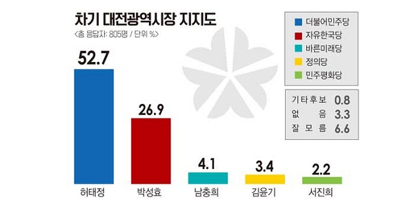 이번 대전시장 후보 여론조사에서 허태정 더불어민주당 대전시장 후보가 52.7%의 지지를 얻어 압도적인 1위를 차지했다. 박성효 자유한국당 대전시장 후보는 26.9%의 지지율을 기록하면서 2위에 머물렀다. 이밖에 남충희 바른미래당 후보는 4.1%, 김윤기 정의당 후보 3.4%, 서진희 민주평화당 후보는 2.2% 지지율을 확보하는데 그쳤다. 기타 후보 0.8%, 없음 3.3%, 잘 모름은 6.6%로 조사됐다.