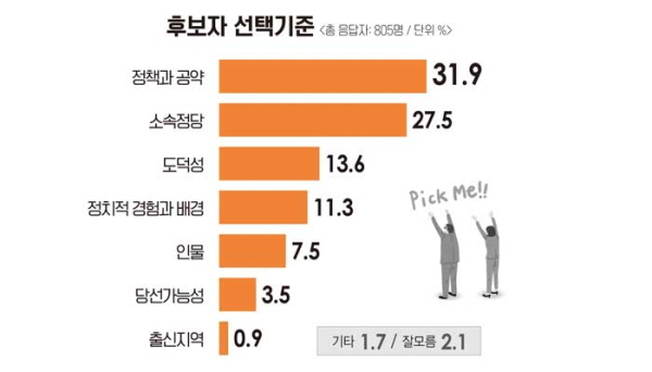 ‘후보자 선택기준’에 대한 질문에서는 정책·공약을 꼽은 응답자(31.9%)들이 가장 많은 것으로 조사됐다. 소속정당이 27.5%로 뒤를 이었고 도덕성 13.6%, 정치적 경험·배경 11.3%, 인물 7.5%, 당선가능성 3.5%, 출신지역 0.9%로 각각 조사됐다. 기타 1.7%, 잘 모름 2.1%이다.