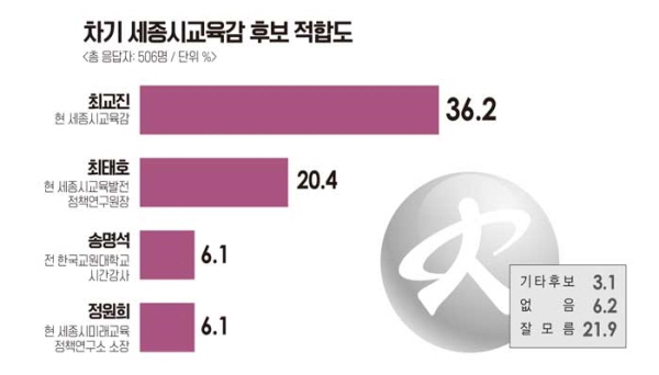 6·13지방선거에 출마하는 차기 세종특별자치시 교육감장 후보 가운데 누가 가장 적합한가를 묻는 ‘차기 세종시 교육감 후보 적합도’ 조사에서 최교진 후보(현 세종시교육감)가 36.2%로 1위를 차지했다.