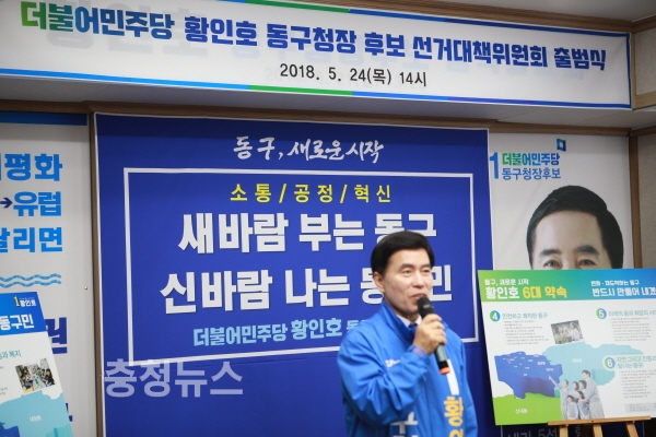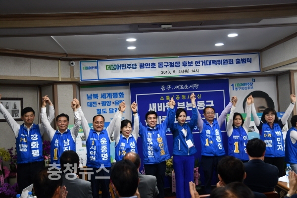 축사에 나선 강래구 동구 지역위원장은 “황 후보의 용광로 선대위 구성을 통해 이번 지방선거에서 압승을 자신한다”며 “지방정부의 완성을 위해 황 후보를 비롯한 시·구의원 후보들도 동구의회에 입성시켜 새로운 동구를 만들어야 한다”고 지지를 호소했다.