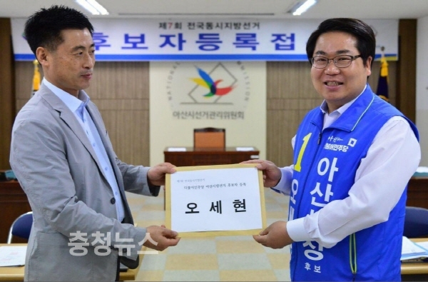 작년 12월 말 공직을 명예퇴직한 오세현 아산시장 후보는 이후 시민들과 만나며 자신이 준비한 정책대안들을 보완해왔으며, 더불어민주당 경선 예비후보 등록 후 5명의 민주당 경선 후보들과 공정한 경쟁을 거쳐 제7회 전국동시지방선거 더불어민주당 아산시장 후보로 공천을 받았다.