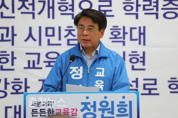 정 후보는 "최근 4년간 세종의 학생들의 학력은 전국 최하위권을 맴돌고 있고, 나아질 기미도 보이지 않으며, 이런 현상이 앞으로 4년 더 지속된다면 세종의 아이들의 미래는 매우 참담하게 될 것이므로 확 바꾸어야 세종교육이 산다"고 말문을 열었다.