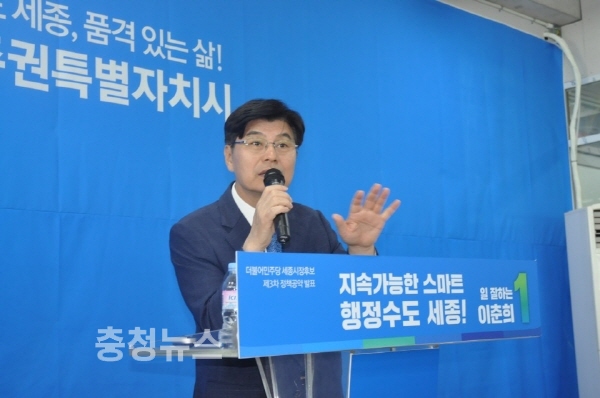 이춘희 더불어민주당 세종시장후보는 28일 사무실에서 '지속 가능한 스마트 행정수도 만들기’제3차 정책공약 발표 기자회견을 열고 경제분야 5대 공약을 발표했다.