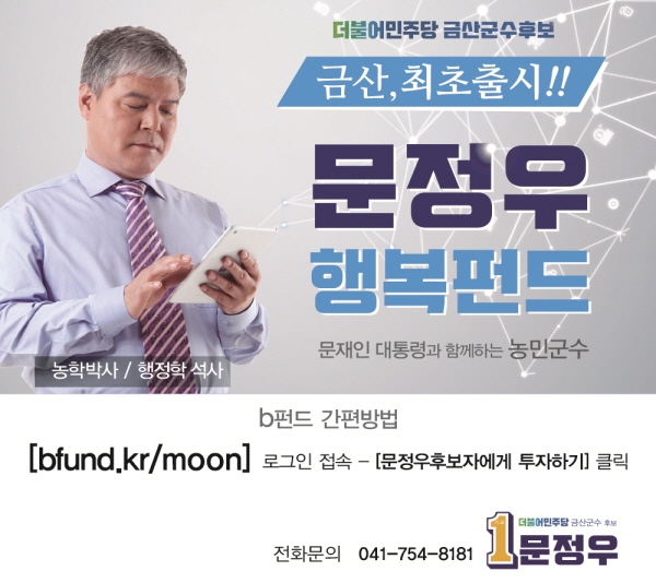 문정우 금산군수 후보는 “군민 여러분이 십시일반 보내주시는 펀드를 통해 유권자의 기대에 어긋나지 않게 반드시 당선에 성공하겠다”며 “군민들의 투자금은 반드시 금산미래 100년으로 보답하겠다”고 말했다.