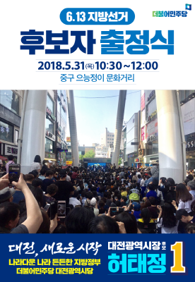 허태정 더불어민주당 대전시장 후보가 으능정이거리에서 본격적인 6.13 지방선거 선거운동에 들어간다.