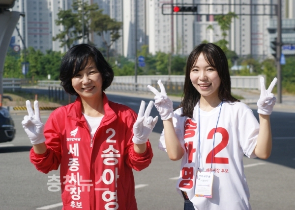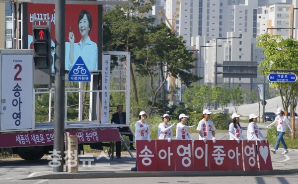 이날 송 후보의 둘째딸인 세진양은 율동을 하면서 어머니를 도와 거리유세 지원에 나서 시민들의 눈길을 끌었다.