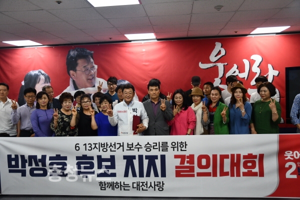 241명 규모의 중도보수 단체 ‘함께하는 대전사랑’ 우명현 회장은 "대전시장이 또 재판만 받다가 임기를 못 채우는 상황을 면하기 위해 대전 미래를 책임질 능력을 갖춘 박성효 후보의 승리를 위해 동참키로 했다"고 지지선언 이유를 밝혔다.