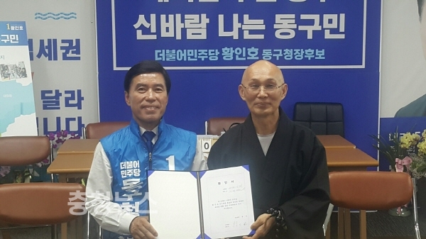 대전시 불교 협회(대표 법안스님)가 4일 오후 더불어민주당 황인호 동구청장 후보에 대해 지지선언 했다.