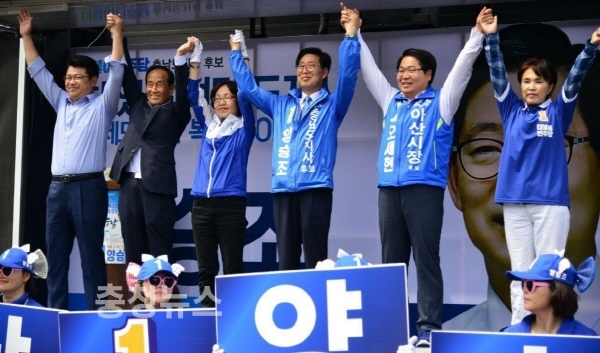 오세현 아산시장 후보는 유세연설에 나서 “지금껏 쌓아온 모든 역량을 발휘해 시민들의 삶이 나날이 나아지는 행복 아산을 만들겠다”고 화답하며 지지자들의 호응을 이끌었다.