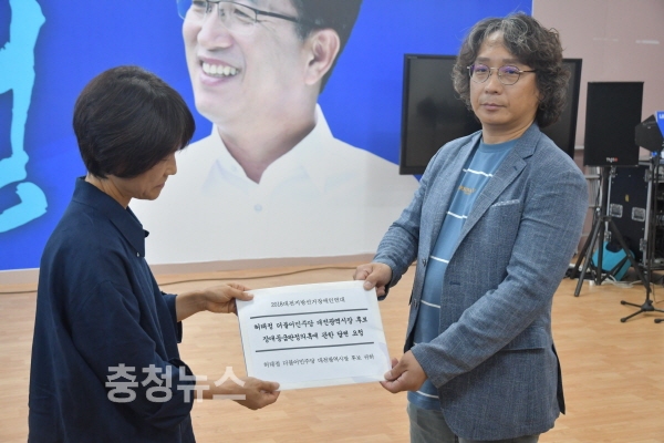 대전지방선거장애인연대 김현기 사무처장(우측)이 허 후보 캠프 관계자에게 답변 요청서를 전달하고 있다.