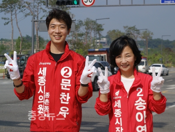 송아영 자유한국당 세종시장 후보가 제11선거구(종촌동) 문찬우 세종시의원 후보와 함께 5일 오전 너비뜰사거리에서 ‘꿈꾸는 세종, 행복한 시민’ 이라는 캠프 슬로건 으로 출근인사에 나섰다.