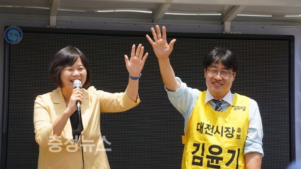 정의당 이정미 대표와 김종대 의원, 한창민 부대표가 6일 오후 대전을 찾아 김윤기 대전시장 후보 지원에 나섰다.