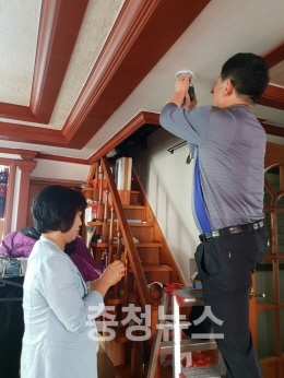 비래동 지역사회보장협의체 민대규 위원장(왼쪽)과 한도섭 위원(오른쪽)이 화재 취약가정을 방문해 화재경보감지기를 설치하고 있는 모습