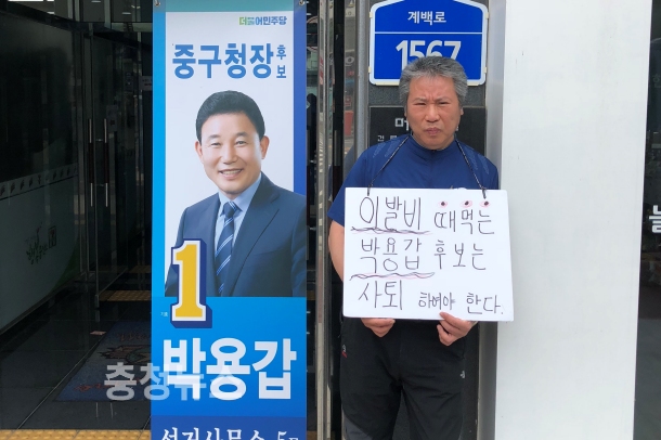 더불어민주당 박용갑 중구청장 후보를 상대로 이발비를 수년간 못 받았다고 주장하는 해당 이용원 대표인 권 모 씨가 결국 1인시위에 나섰다.